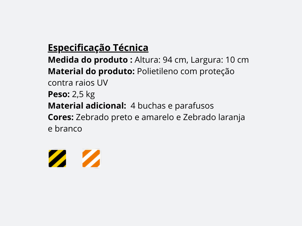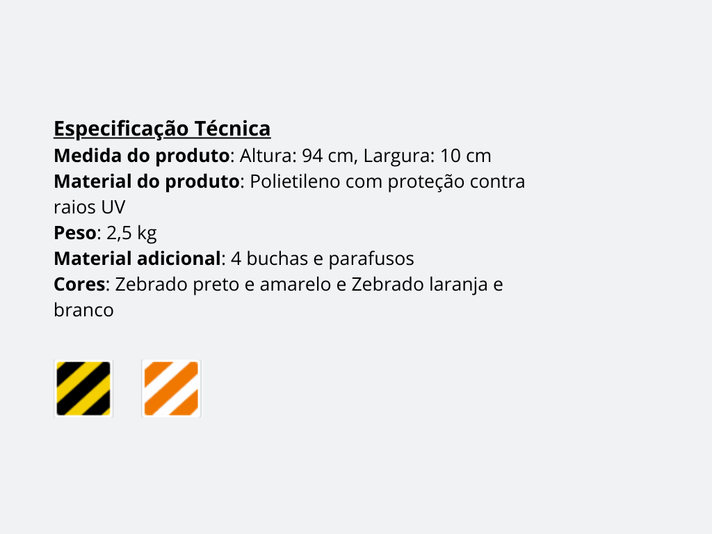 O Balizador Flex 94 cm CDI é ideal para delimitar e organizar espaços com segurança e praticidade. Fabricado em polietileno com proteção UV, possui duas faixas refletivas prismáticas, garantindo excelente visibilidade mesmo em ambientes com pouca iluminação, conforme a norma ABNT 14.644.