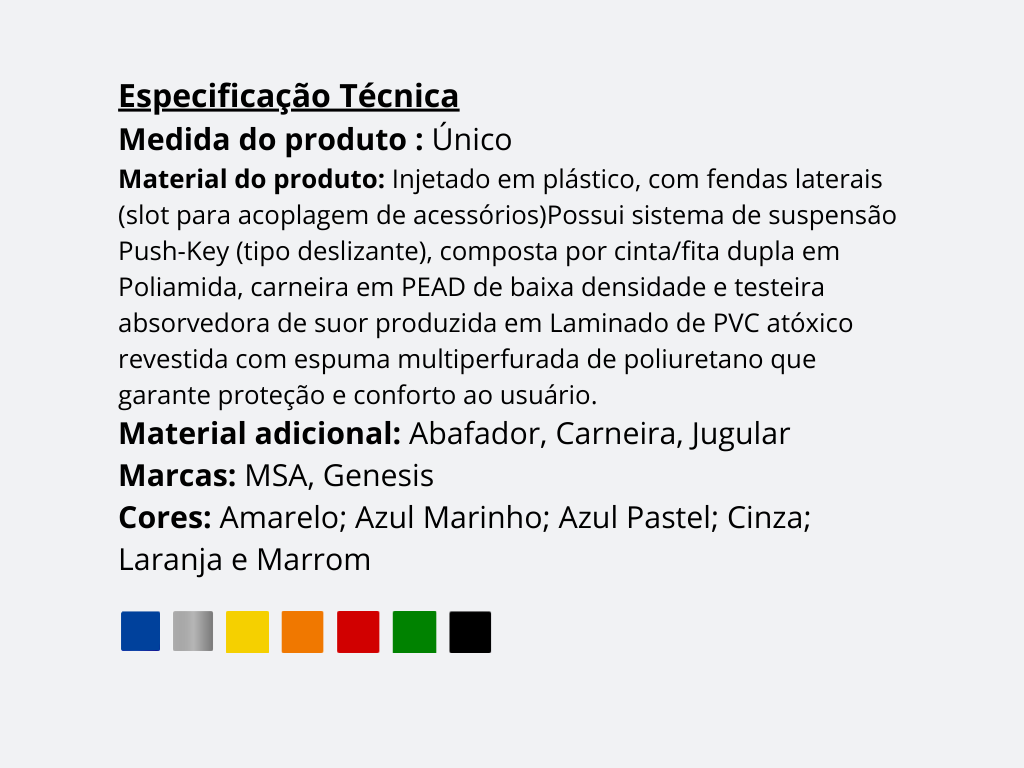 Os Capacetes CDI, das marcas MSA e Genesis, oferecem proteção confiável para ambientes industriais e de alto risco, com destaque para os modelos com aba frontal, jugular e suspensão interna ajustável.